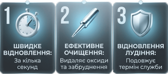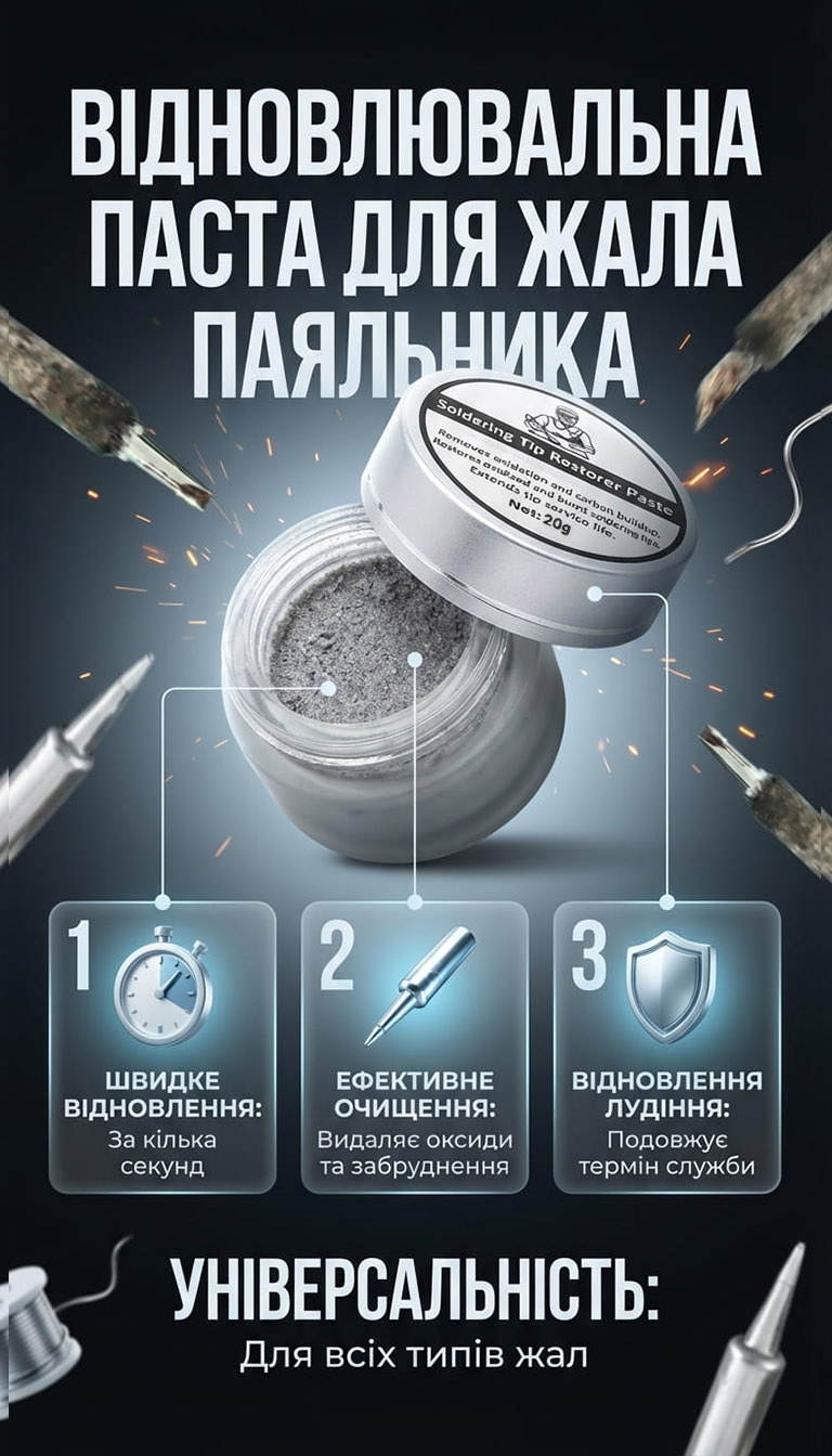 Паста очисник для паяльника — професійне рішення для відновлення жала паяльника. Миттєво видаляє оксиди, нагар та залишки припою, повертаючи жалу здатність до лудіння. Ідеально підходить для паяльників з міднім та нікелевим покриттям.