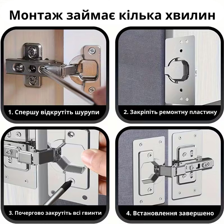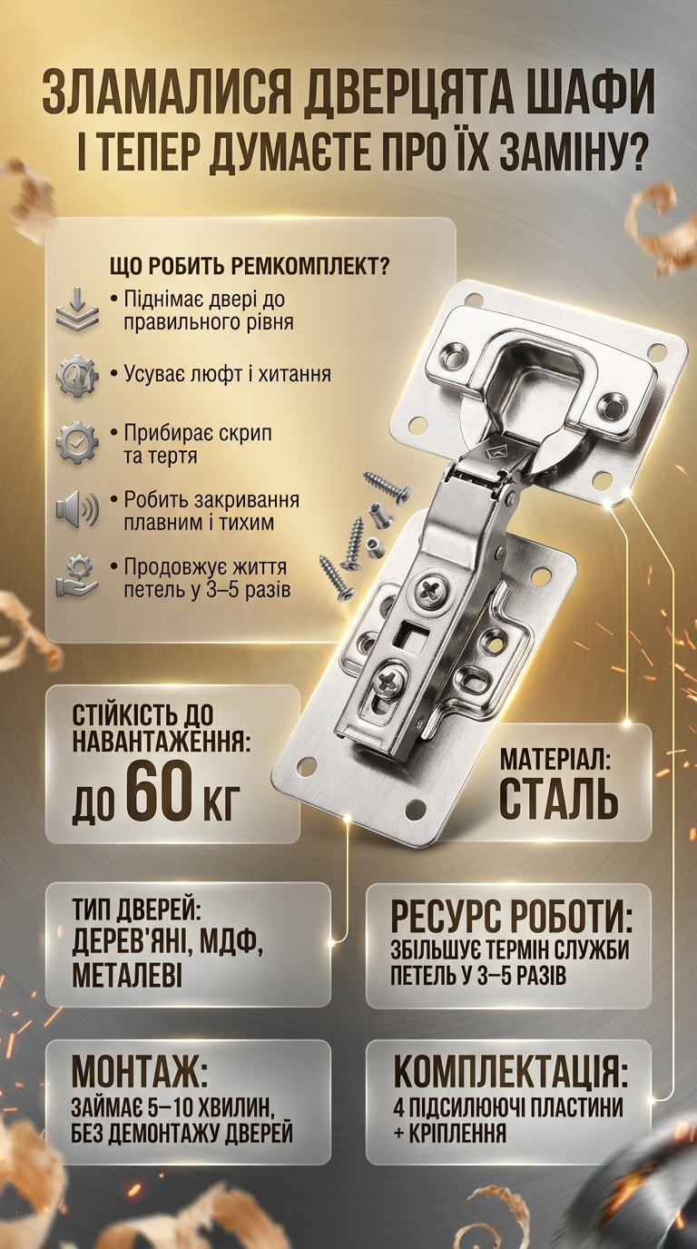Не потрібно міняти петлі чи викликати майстра. Ремкомплект дозволить швидко та недорого відновити їхню роботу.